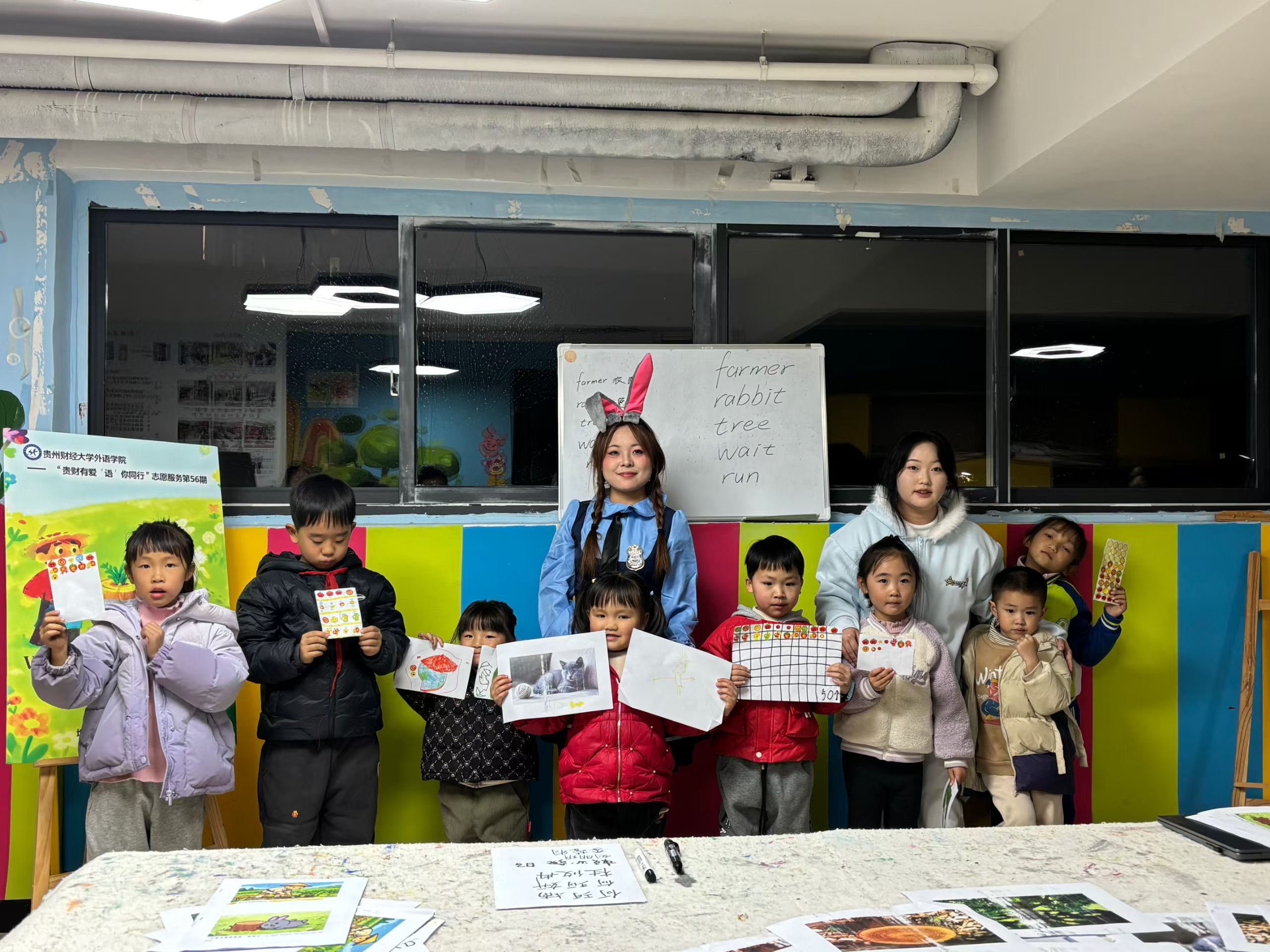 “贵财有爱‘语’你同行第56期活动在贵州财经大学西校区公租房社区A1活动室顺利开展。志愿者王承菊、冯周、陈光艳、刘汉燊共同为小朋友们带来了一堂别开生面的英语趣味课堂。本期活动以“Wait for gains without pains”(《守株待兔》)为主题,巧妙地将经典寓言与趣味游戏相融合,让孩子们在亲身体验中读懂寓言内涵,在快乐互动中感受英语魅力。