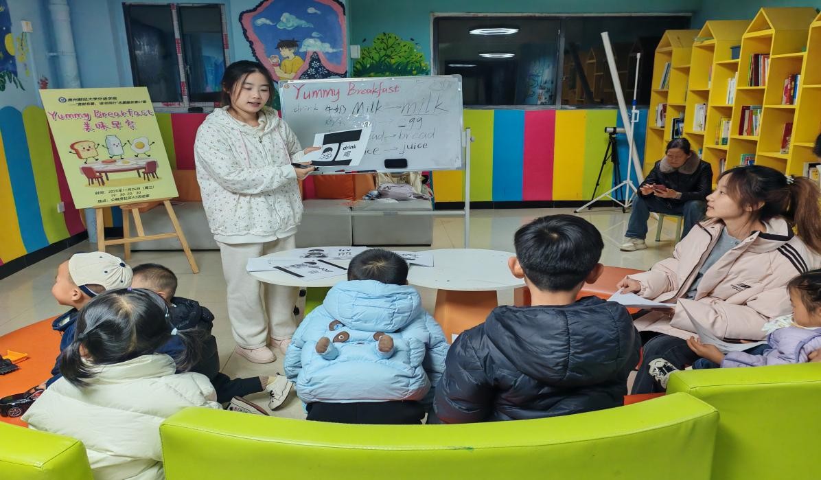 “贵财有爱 ‘语’你同行”第57期活动在贵州财经大学西校区公租房社区A3活动室温馨开启。志愿者高淼、张田田、黄倩为小朋友们带来了一场以“Yummy Breakfast(美味早餐)”为主题的英语趣味课堂。活动通过儿歌律动、实物互动、趣味游戏等形式,让孩子们在欢乐中学习早餐相关英语词汇,感受英语表达的乐趣。