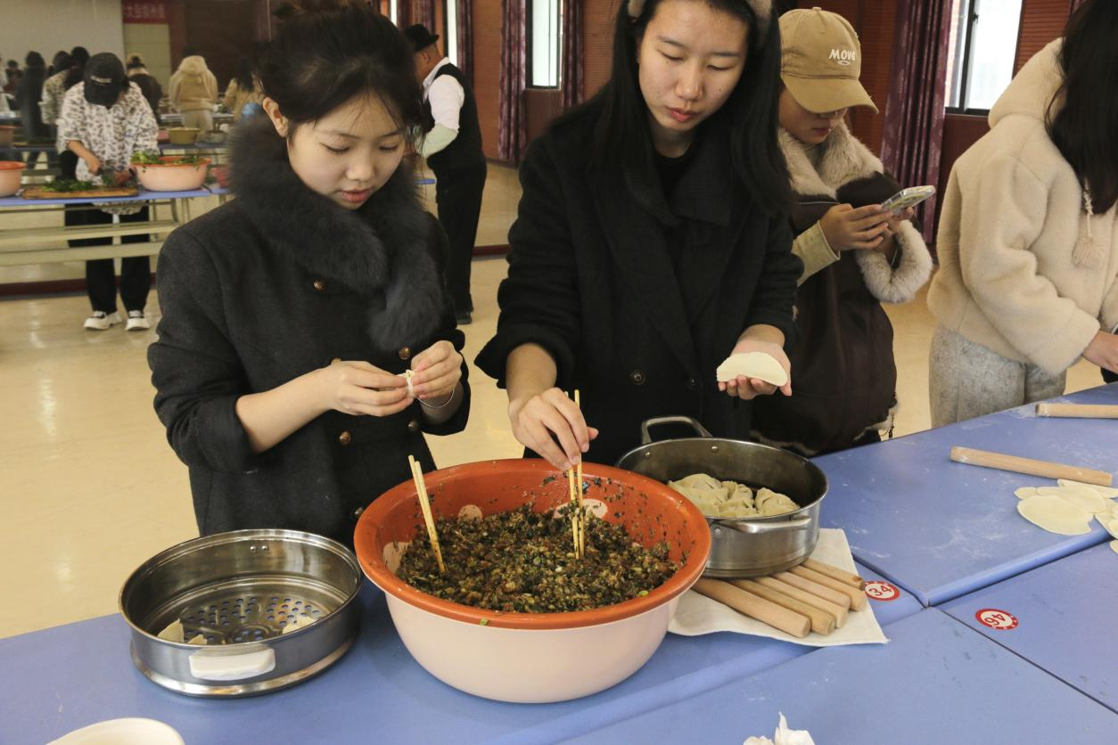 非遗剪纸体验与“补冬”包饺子环节则将劳动教育落到实处,同学们手持剪刀创作雪花、寒梅等节气主题剪纸,在指尖流转中感受非遗魅力;围站一起分工协作包饺子,揉面、擀皮、填馅有条不紊,在动手实践中体会“民以食为天”的劳动智慧,更在协作中增进了外院学子凝聚力。