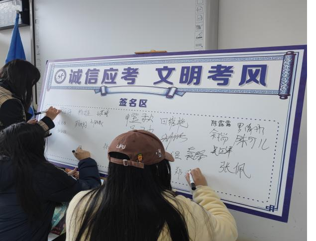 诚信考试承诺书》。部分学生代表还主动在“诚信应考 文明考风”宣传板上签名,表达自觉维护考试纪律、共同营造健康学风的决心。