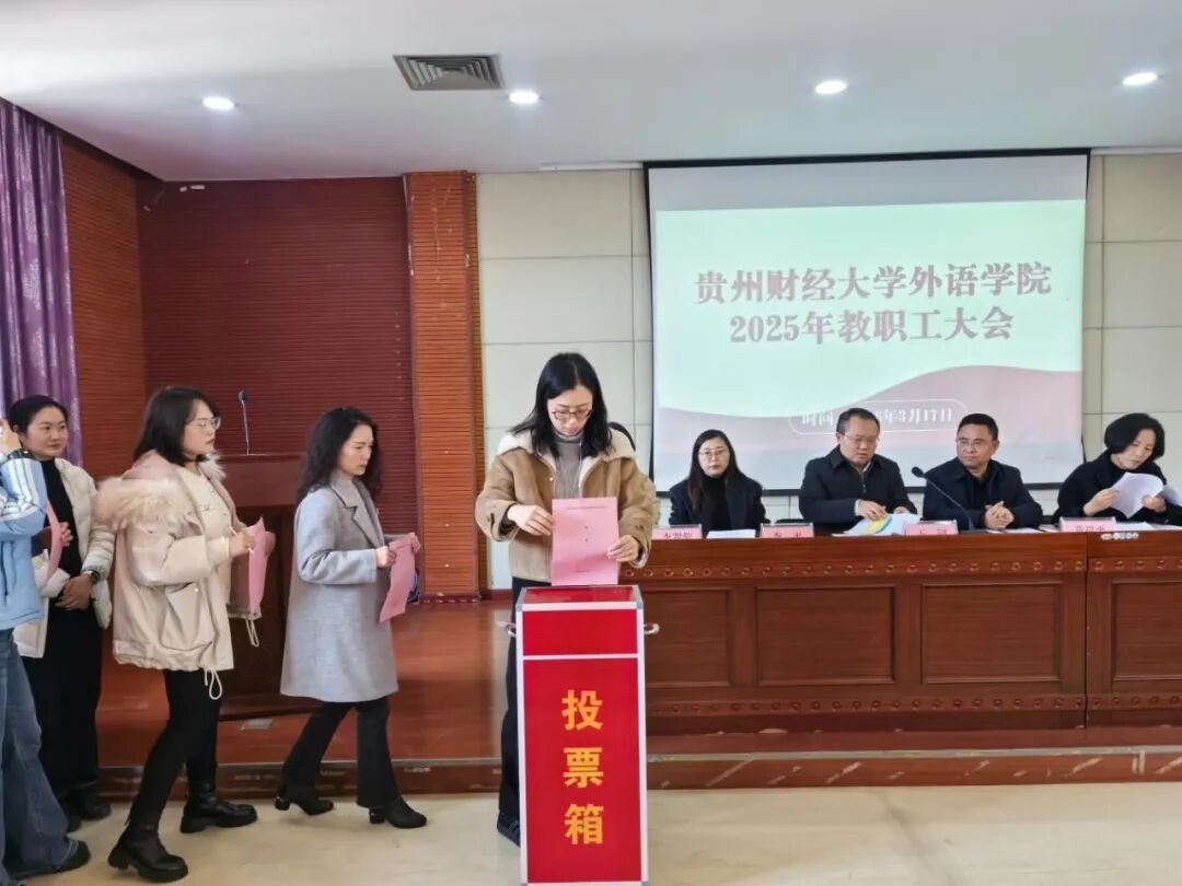 大会还以书面形式听取了《2025年学院工会工作报告》。与会人员秉持负责任的态度,认真审议并一致通过了3个报告。会上,进行了贵州财经大学教职工代表大会和工会会员代表大会代表的换届选举。按照选举办法,在充分酝酿讨论的基础上,经学院党委会、党政联席会研究,提出候选人15名,大会以无记名投票方式,差额选举产生王景洁、王钊、刘利音、邢家玮、李翠蓉、李永兰、杨晨、赵智利、高彩慧、袁先婷、崔芳芹、黄贵平、曾选等13名同志为贵州财经大学第八届教代会暨第九届工代会第一次代表大会代表。