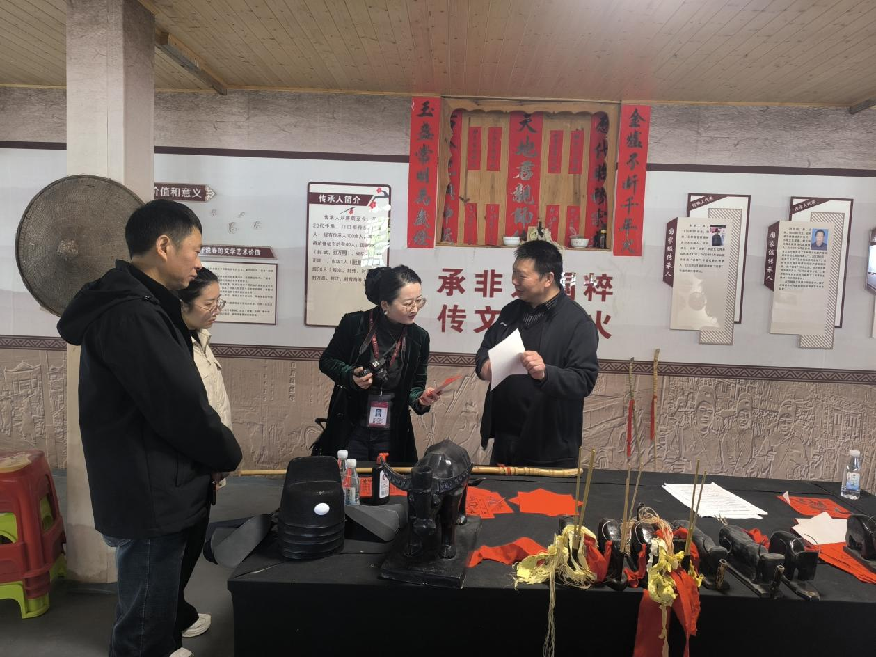 调研活动得到了石阡县委宣传部的大力支持。在县委宣传部易秉荣副部长的统筹协调及工作人员的全程陪同下,调研组一行深入“中国说春之乡”--花桥镇坡背村。作为国家级非物质文化遗产“石阡说春”的发源地,坡背村保留着完整的说春文化生态。坡背村党支部书记、县级“说春”传承人封永老师热情接待了调研组,并带领大家参观了说春传承基地。封老师详细介绍了春贴的传统制作工艺,生动解读了春词中蕴含的农耕智慧与节气文化,并向调研团队赠送了2025年及2026年春贴实物。调研期间,两位老师还就春词的内容体系、“说春”的传承现状及当前传播方式等问题,与封老师及现场工作人员进行了深入探讨,获取了大量珍贵的一手资料。