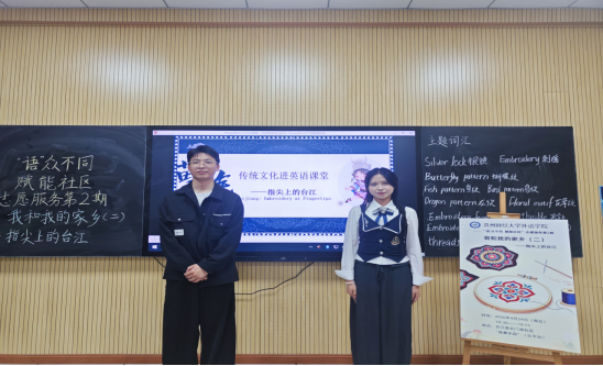 第2期“‘语’众不同 赋能社区”志愿服务活动在贵州财经大学西校区励学楼318教室如期开展。本期以“指尖上的台江——Taijiang: Embroidery at Fingertips”为主题,志愿者李婷婷、张阗、刘汉燊通过云端连线,带领台江县北门湾社区“益童乐园”的小朋友们,从苗族刺绣中学习英语表达,在纹样故事里感知家乡文化。