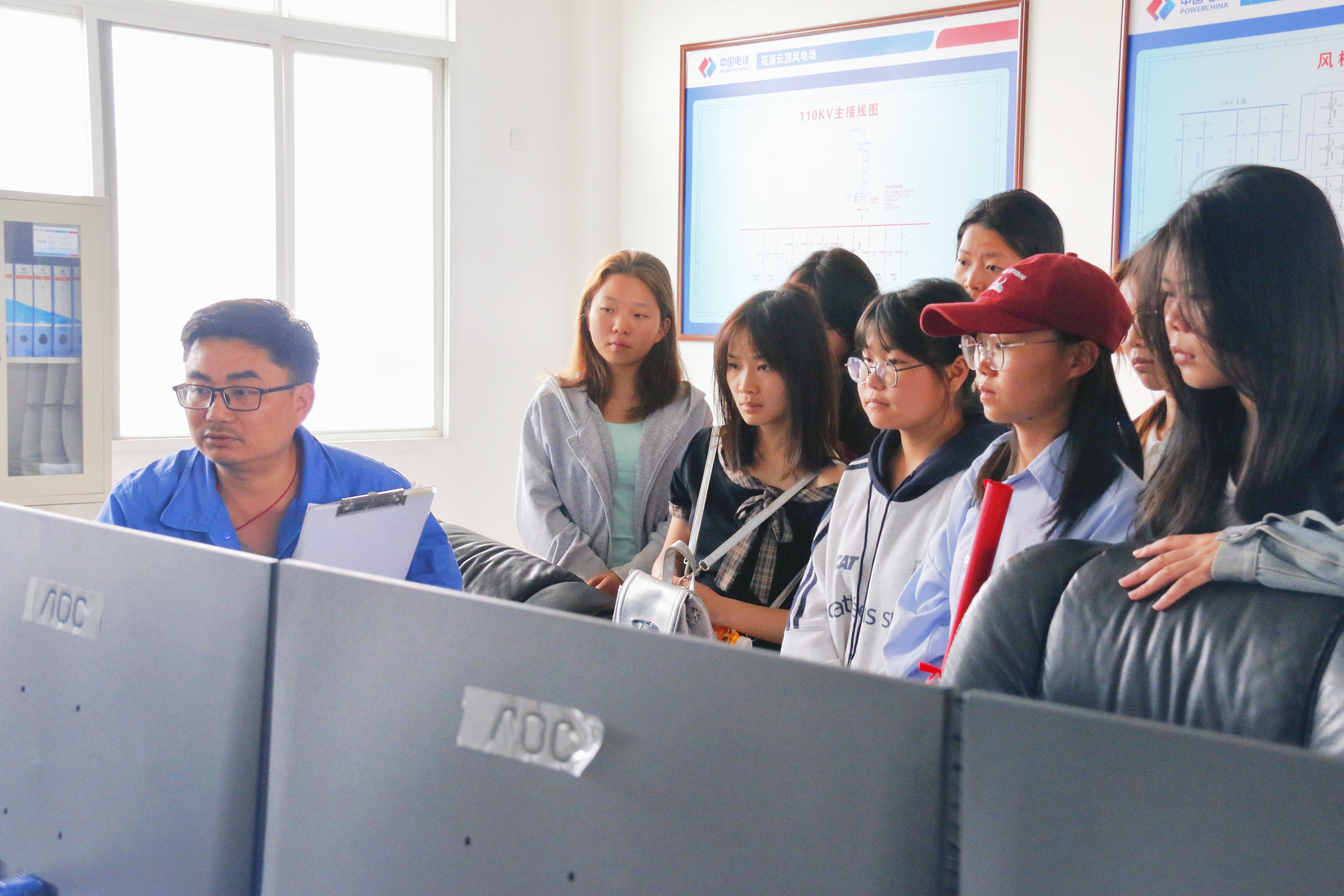 进入风电场的中控中心,沈老师结合实时监控大屏与设备面板,详细介绍了云顶风电场的建设规模、年发电量及其在节能减排方面的显著成效。云顶风电场布局48台风电机组,年发电量约1.4亿度,可满足10万户家庭年用电需求。项目每年可节约标煤5.38万吨,为贵州绿色低碳发展注入强劲动力。大家认真聆听、积极提问,对风力发电的技术细节有了清晰的认识。