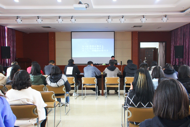 首先,谭老师进行了自我介绍,并对日语专业的就业情况进行了介绍。他还根据社会和市场经济的发展需要,介绍了日语专业培养目标。他提出了“三个选择,三个机遇”的观点,认为当前要从培养“厚基础、宽口径、高素质”,实用商务人才出发,培养有一定的日语语言基础知识,又有一定的国际商务知识和知识结构的复合型应用型专业日语人才。希望大家多参加实践活动锻炼自己,增加自信。